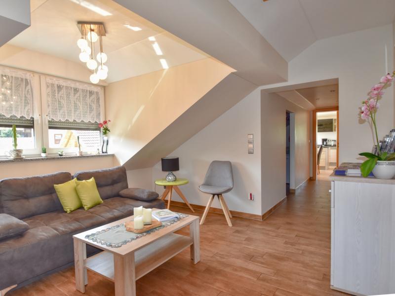 Op de 2e etage: gang, woonkamer met TV(flatscreen, satelliet), zithoek, radio, tafelvoetbal , keuken met eettafel, fornuis(keramisch, inductie), koffiezetapparaat(filtermaling), oven, afwasmachine, koelkast(+ vriesvak) , slaapkamer met 2-pers. bed(180 x 200 cm), 1x kinderbed (incl. beddengoed) , slaapkamer met 2x 1-pers. bed(100 x 200 cm) , badkamer met ligbad, 2x wasbak, douche, wc, haardroger , berging met wasmachine , berging met koel-/vriescombinatie, 1x kinderstoel, strijkplank, strijkijzer